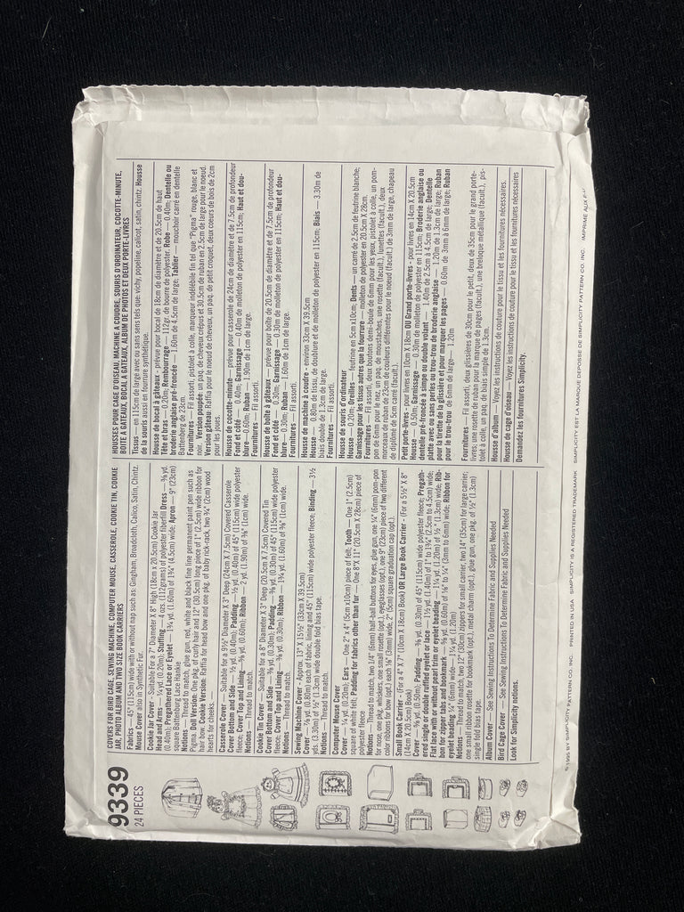 Covers for bird cage, sewing machine, computer mouse, casserole, cookie tin, cookie jar, photo album and two sizes of book carriers