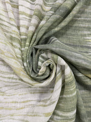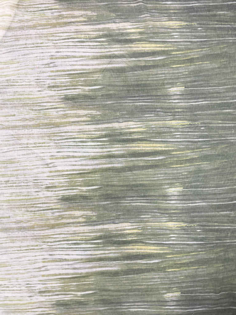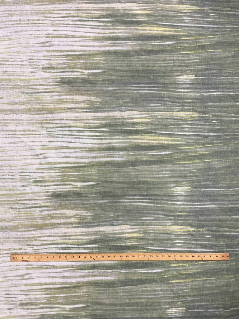 Just under 1/2 of the width is plain off white before the green begins. Due to width of fabric the entire width is not pictured.