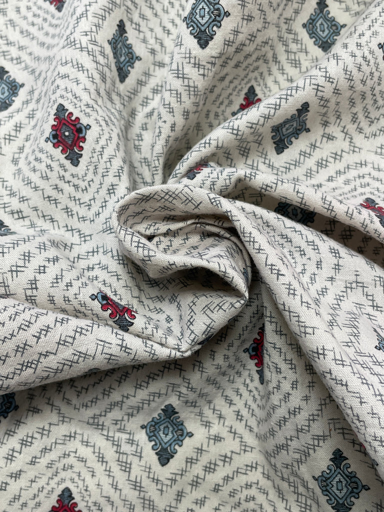 7/8 YD Cotton Remnant Vintage - Gray and Red Diamond Motifs on Off White
