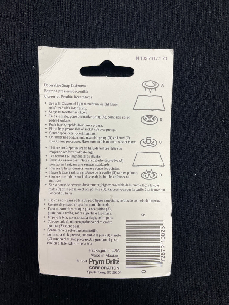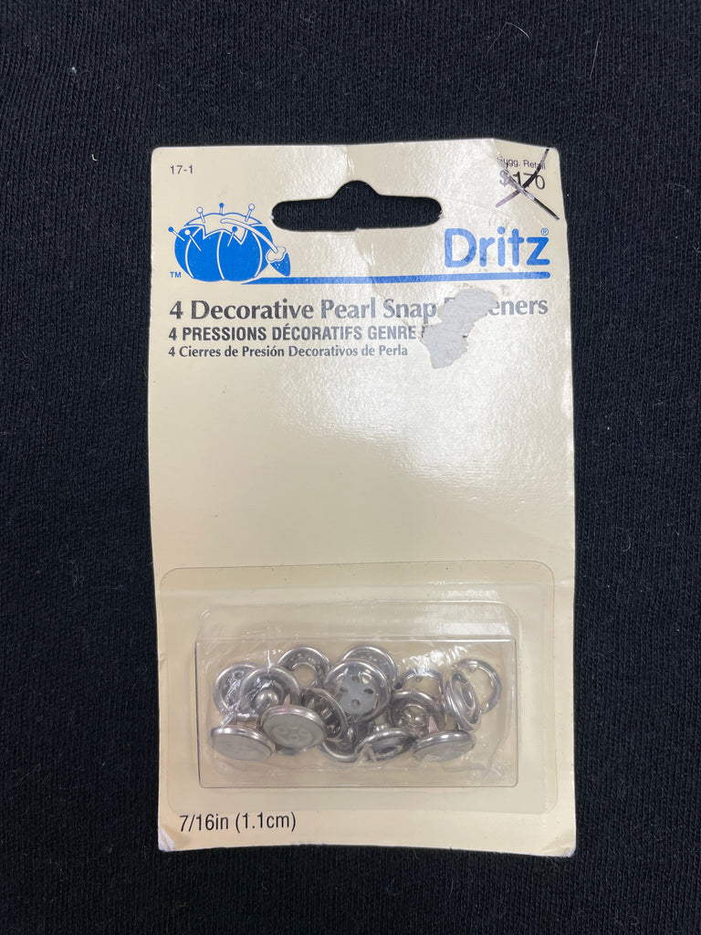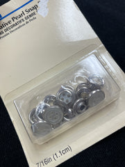 Silver-toned metal with pearlescent white plastic "4-hole button" tops.