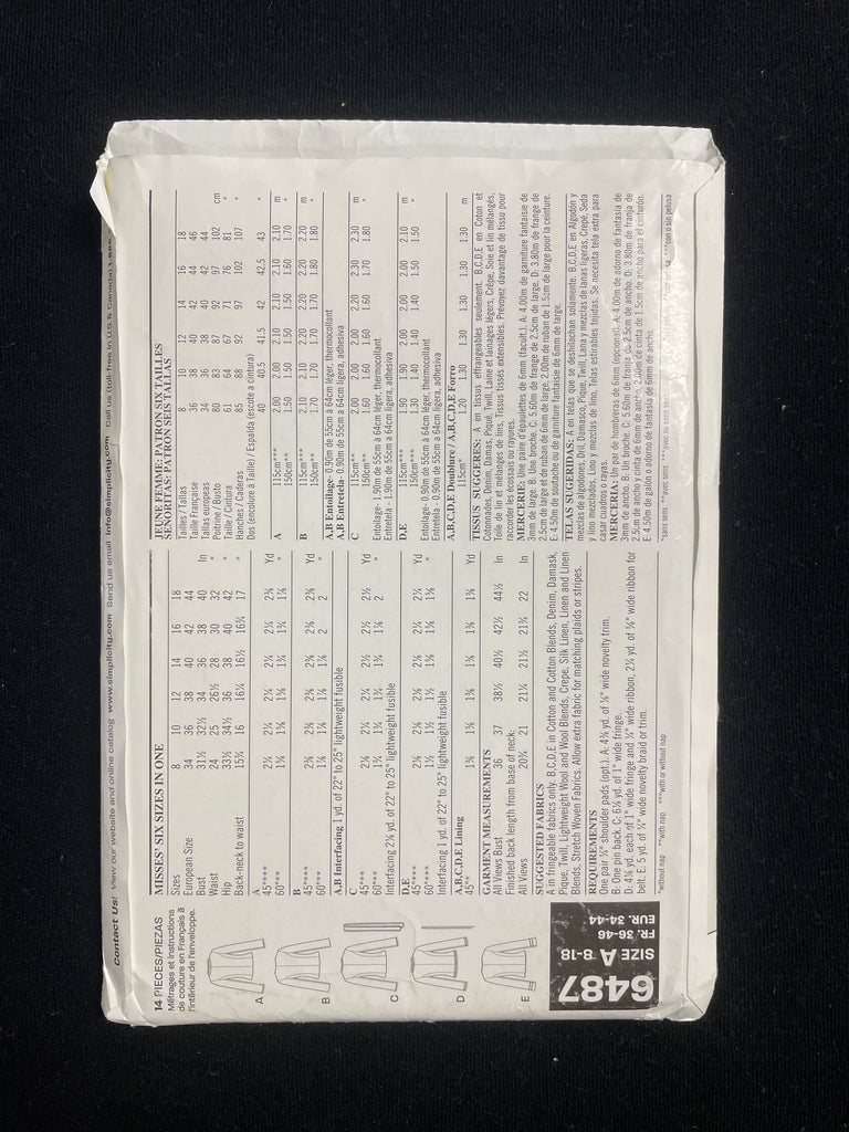 Pattern Pieces: missing armhole facing (piece #4) but instructions are included.