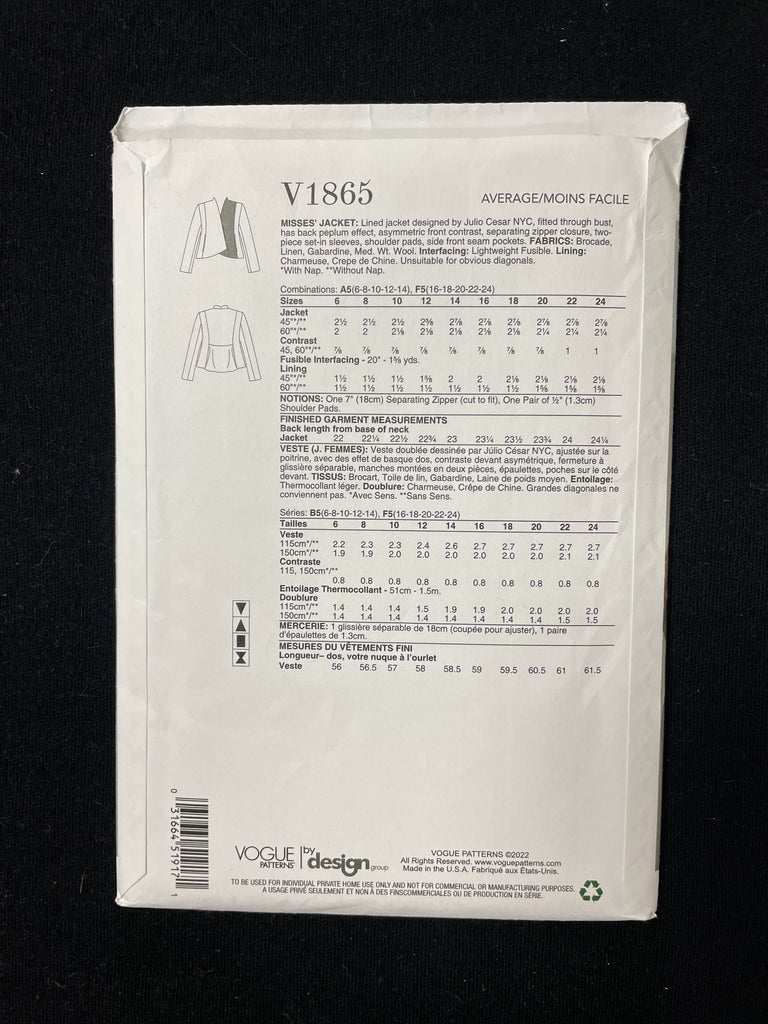 2022 Vogue 1865 Sewing Pattern - Women's Jacket FACTORY FOLDED