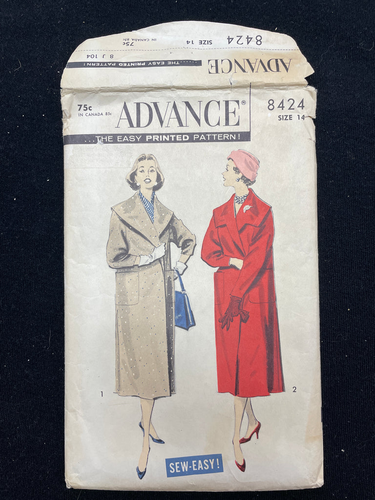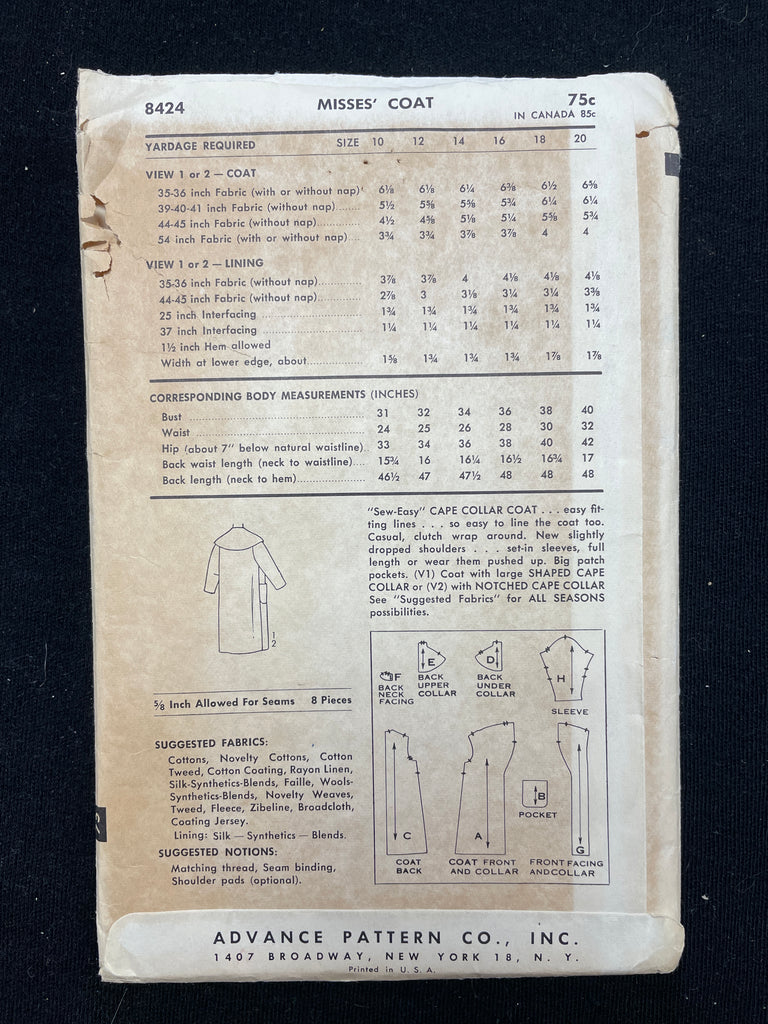 1950's Advance 8424 Sewing Pattern - Adult Coat