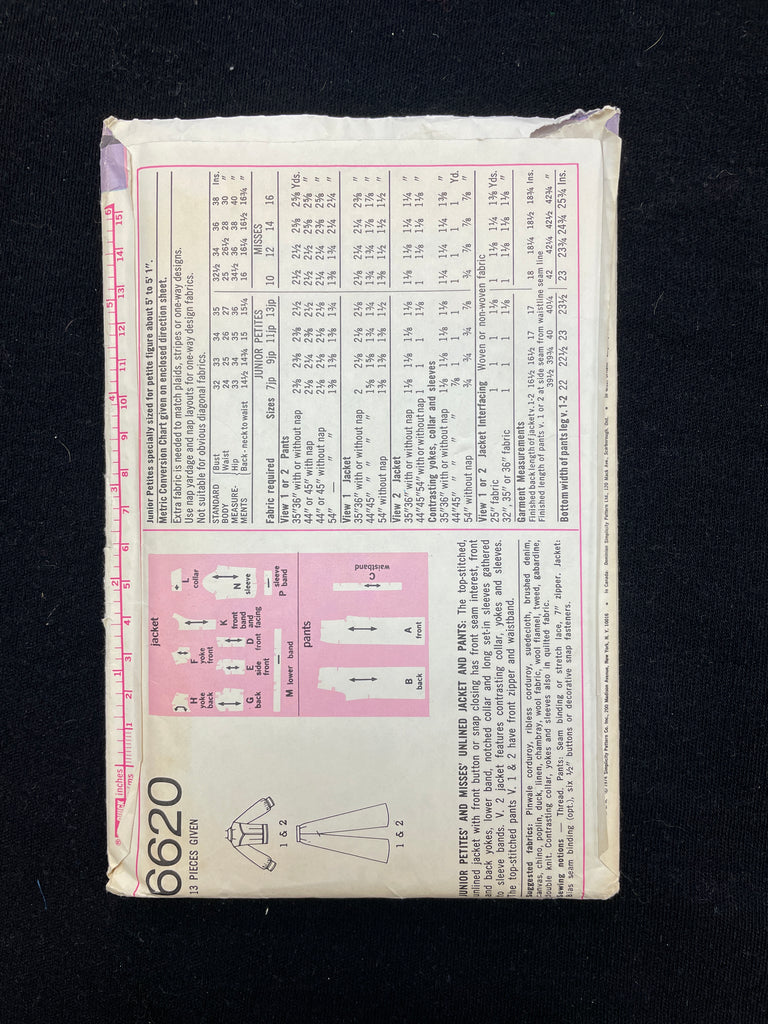 1974 Simplicity 6620 Sewing Pattern - Adult Jacket and Pants