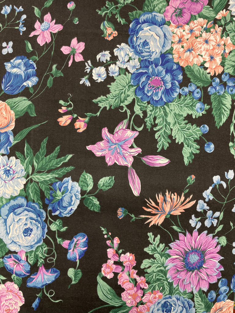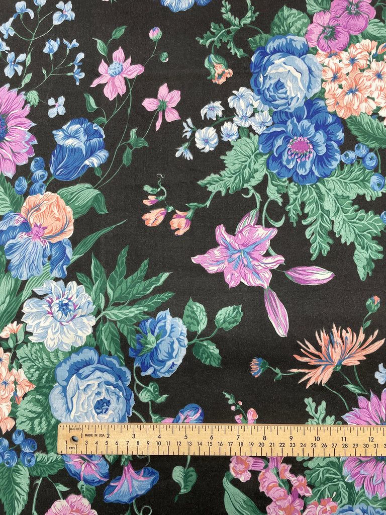 1 3/8 YD Poly/Cotton - Peach, Purple and Blue Flowers on Black