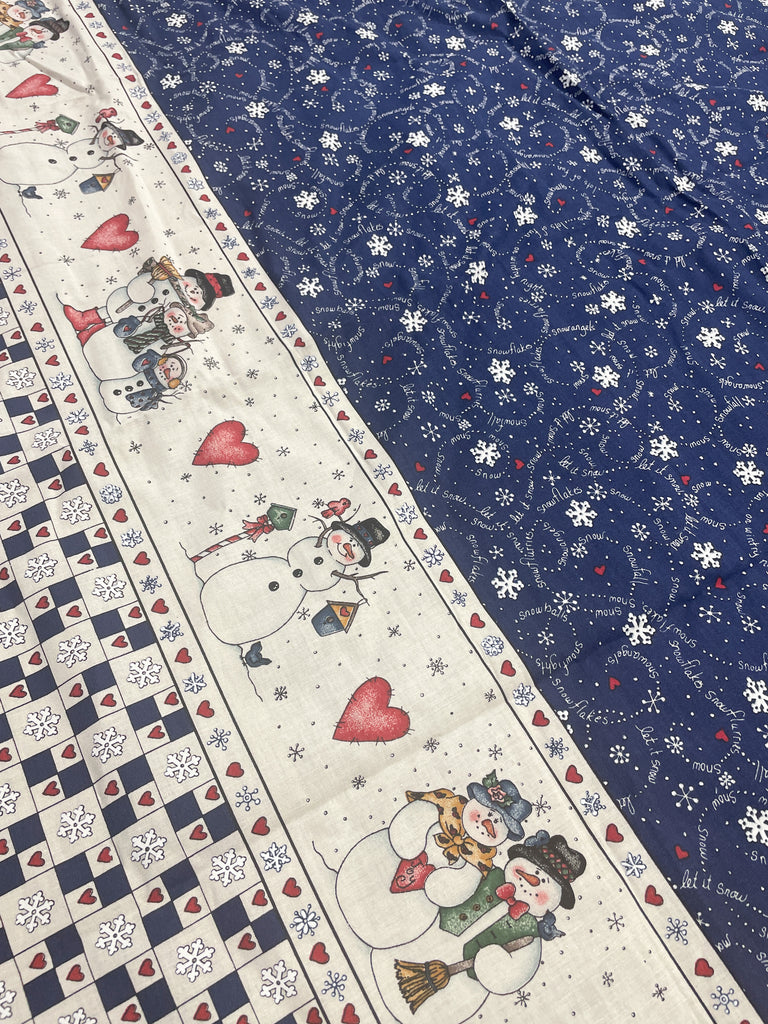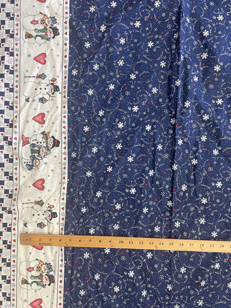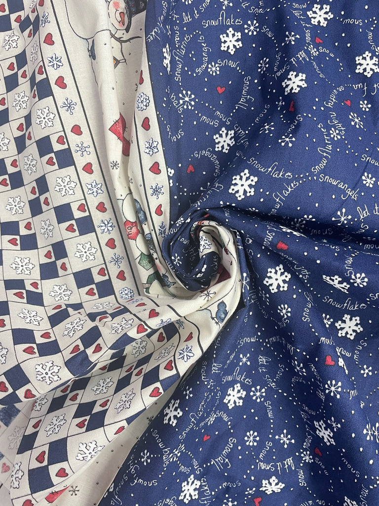 2 Quilting Cotton - Snowflakes on Navy Blue with a Border of Snowmen on Off White