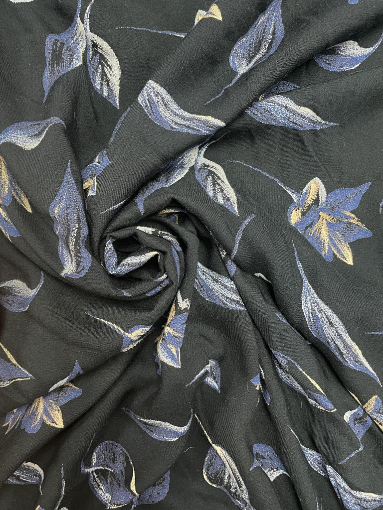 Rayon Vintage - Blue, Tan and White Flowers on Black
