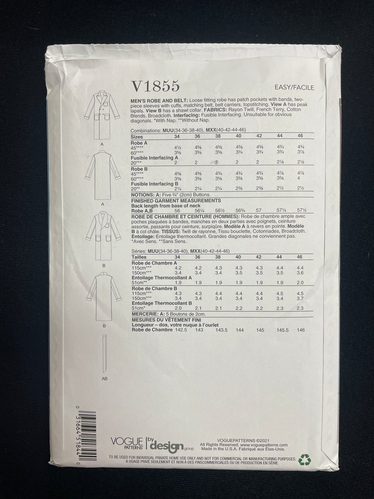 2021 Vogue 1855 Sewing Pattern - Bathrobe and Belt FACTORY FOLDED
