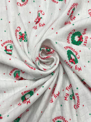3/4 YD Nylon Knit Vintage - White with "My First Christmas"