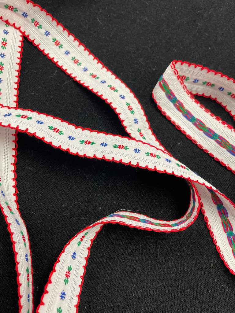 Nylon Woven Ribbon Trim - White with Red Scalloped Edge and Blue and Red Flowers