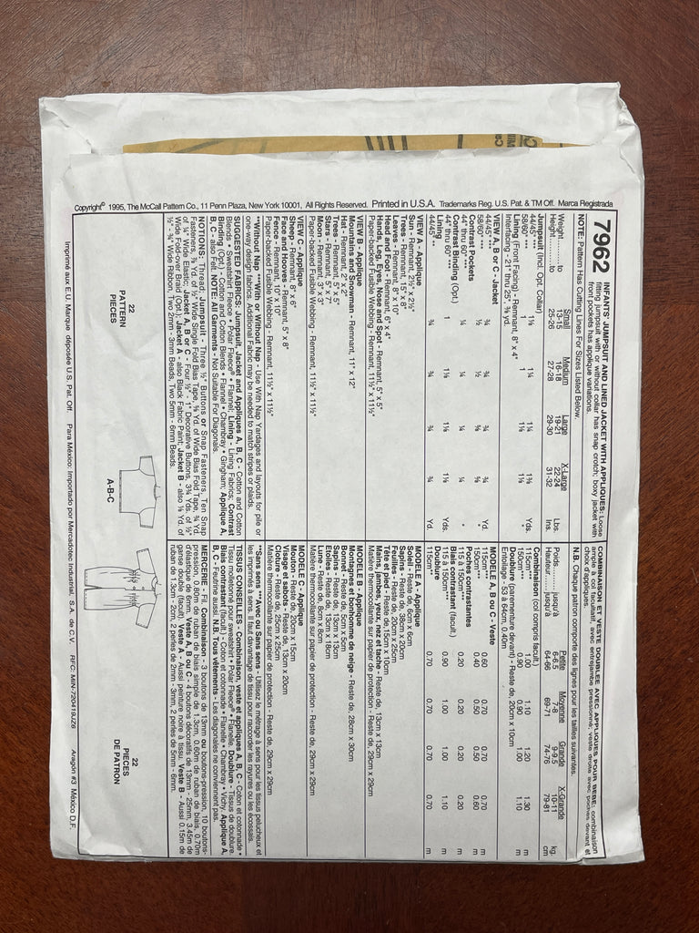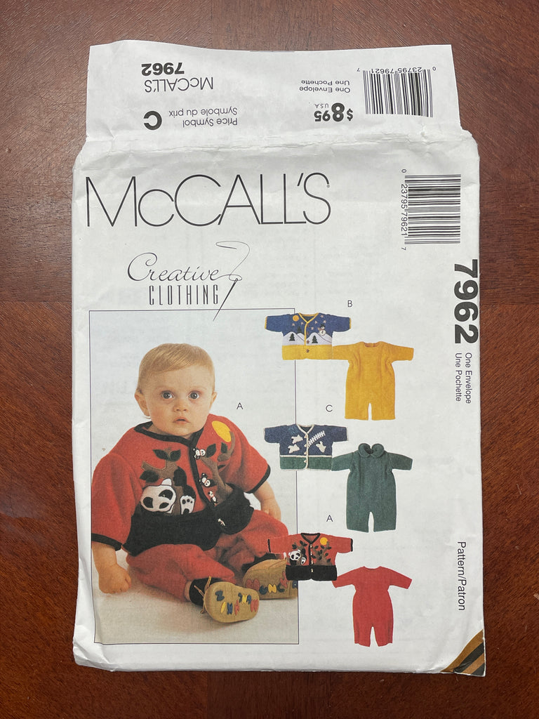 1995 McCall's 7962 Pattern - Infant Jumpsuit and Jacket with Appliques FACTORY FOLDED