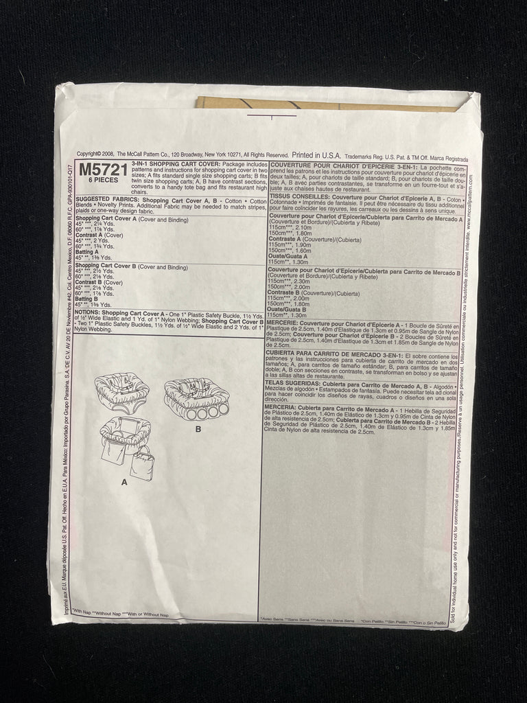 2008 McCall's 5721 Sewing Pattern - Shopping Cart Cover FACTORY FOLDED