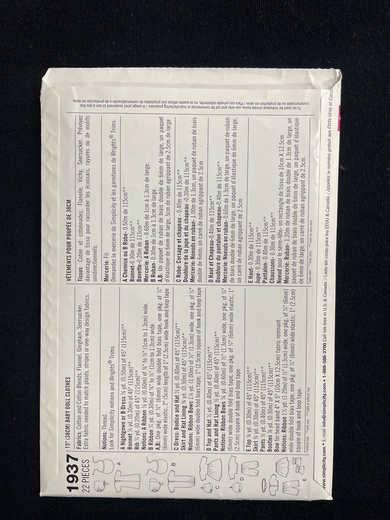 2012 Simplicity 1937 Sewing Pattern - 15" Doll Clothes FACTORY FOLDED