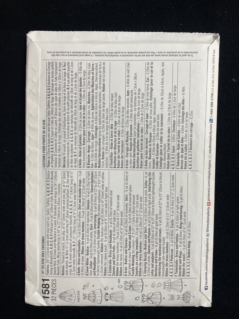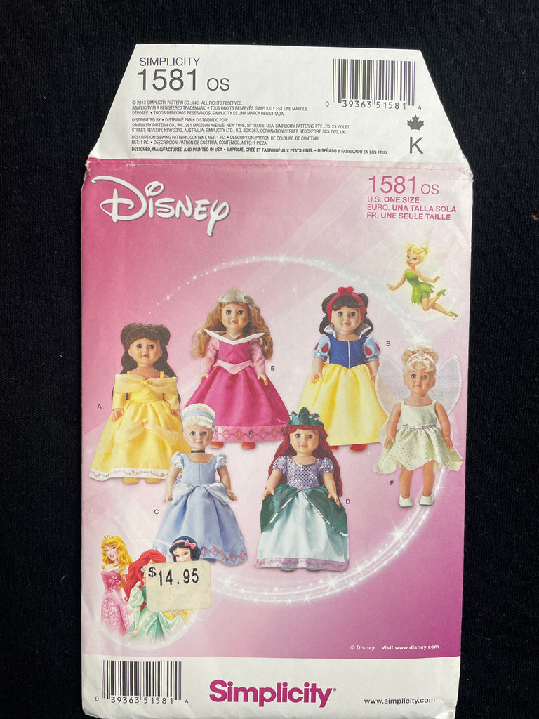 2013 Simplicity 1581 Pattern - 18" Doll Disney Princess Costumes FACTORY FOLDED