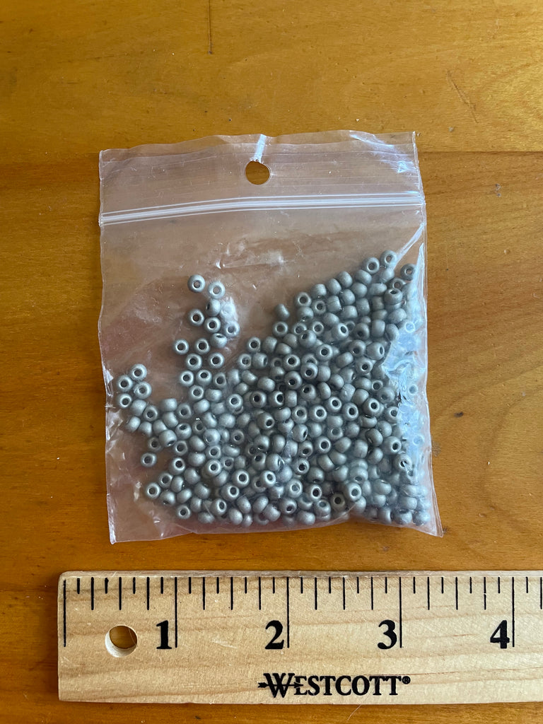 Bag of seed beads in a gunmetal gray with a pearly finish.