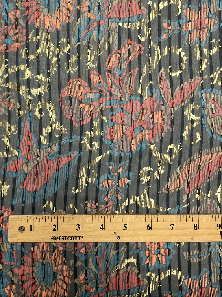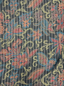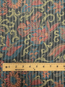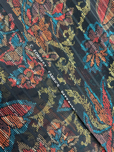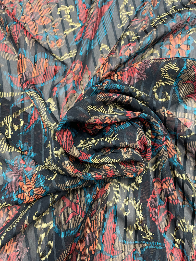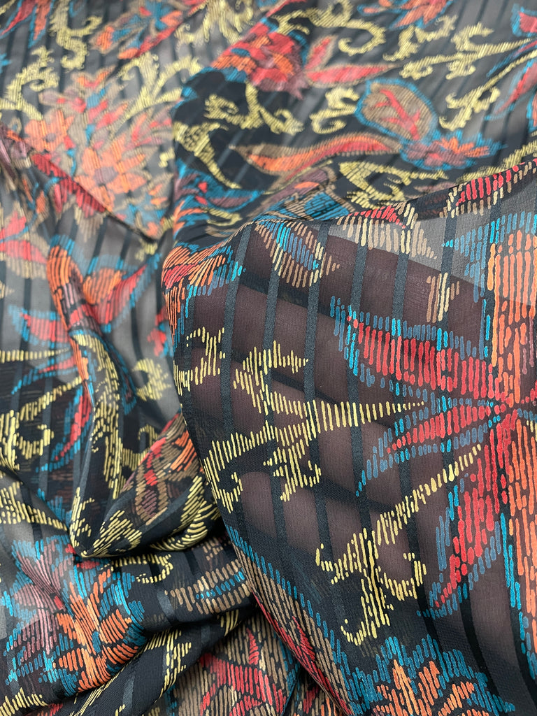 Nylon Chiffon with Self Stripe Vintage - Black with Blue, Red and Orange Flowers and Golden Yellow Filigree