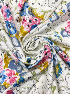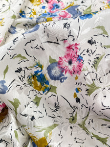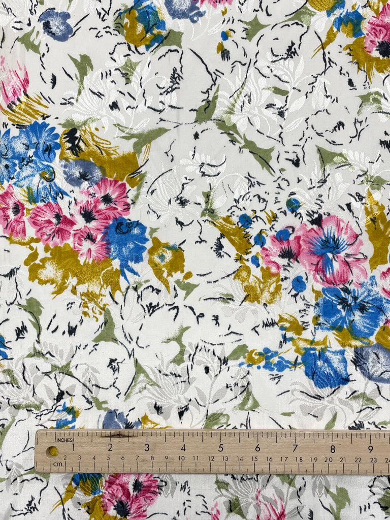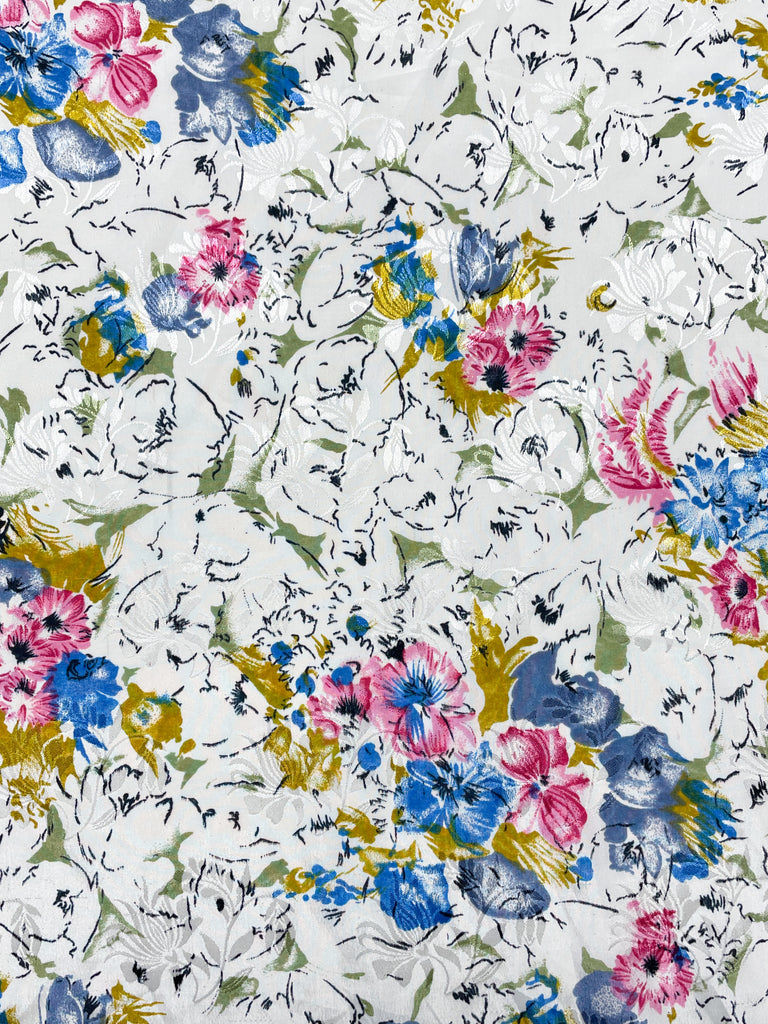 White on white woven floral jacquard printed with with blue and pink and golden yellow flowers.