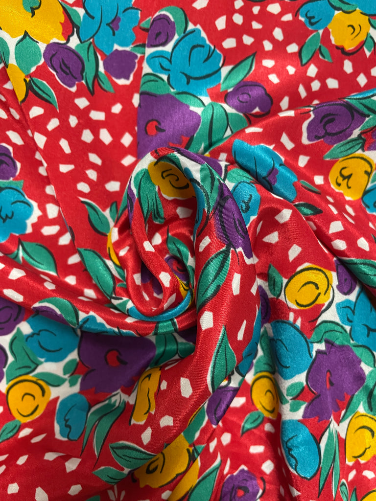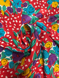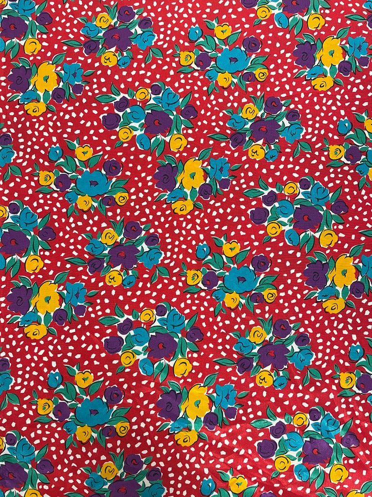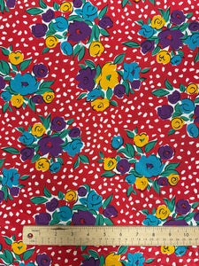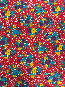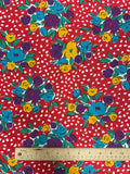 Polyester Vintage - Turquoise, Purple and Yellow Flower Clusters on Red with Angular White Dots