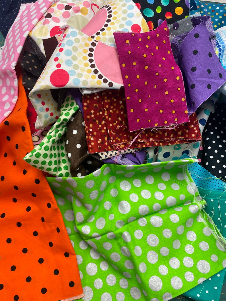 This listing is for 1 pound of quilting cotton fabric scraps in polka dot prints in various colors and sizes.